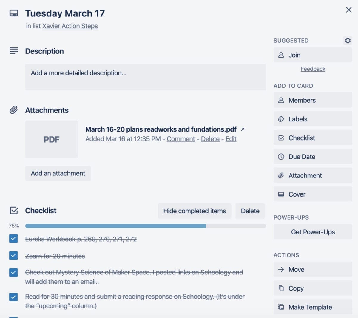 This column will contain any extra ideas for learning. If you get any ideas from Facebook, an email, Pinterest, your friend, and you think it could be a good fit for your child, throw it in this list! It’s essentially a dump list. You can store information and files within each card, more on that soon. If you decide to put one of these ideas into action, you can drag it over to the Action Steps list or place it into a checklist.